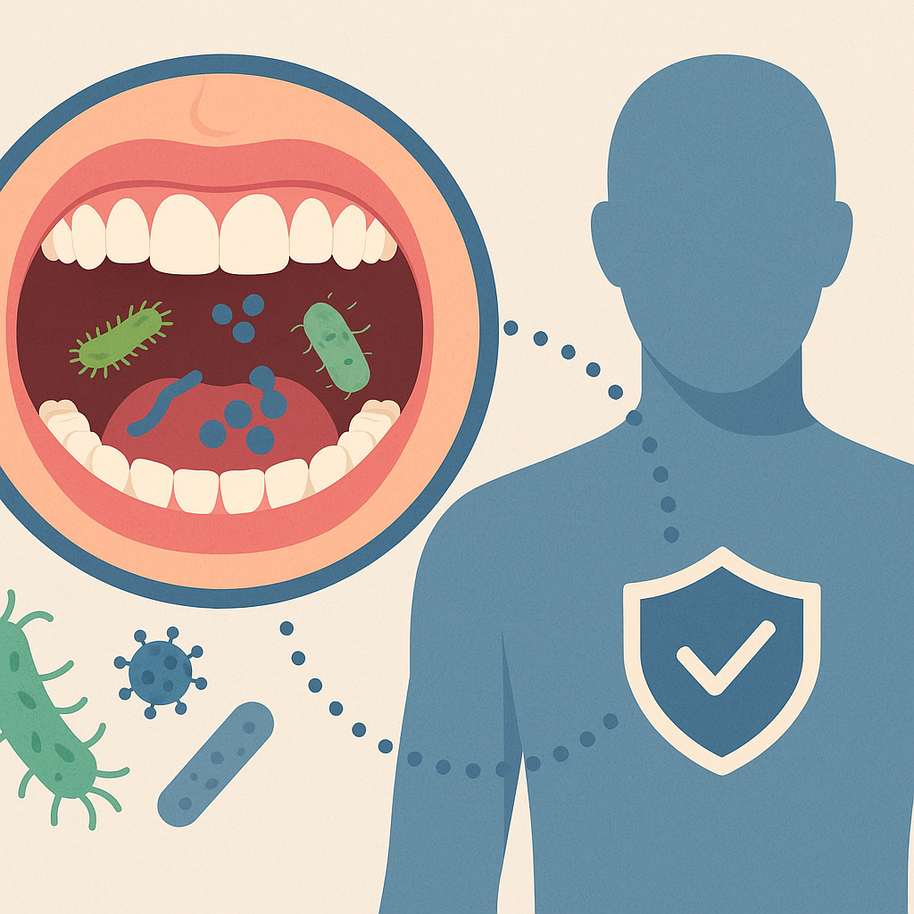 Sliznice dutiny ústní je jedním z prvních obranných systémů těla. Je vybavená imunitními buňkami, které reagují na přítomnost bakterií a virů. Pokud je mikrobiom v rovnováze, tělo funguje efektivně a reaguje přiměřeně. Pokud však převládnou patogenní mikroorganismy, imunitní systém se dostává do chronické zátěže.